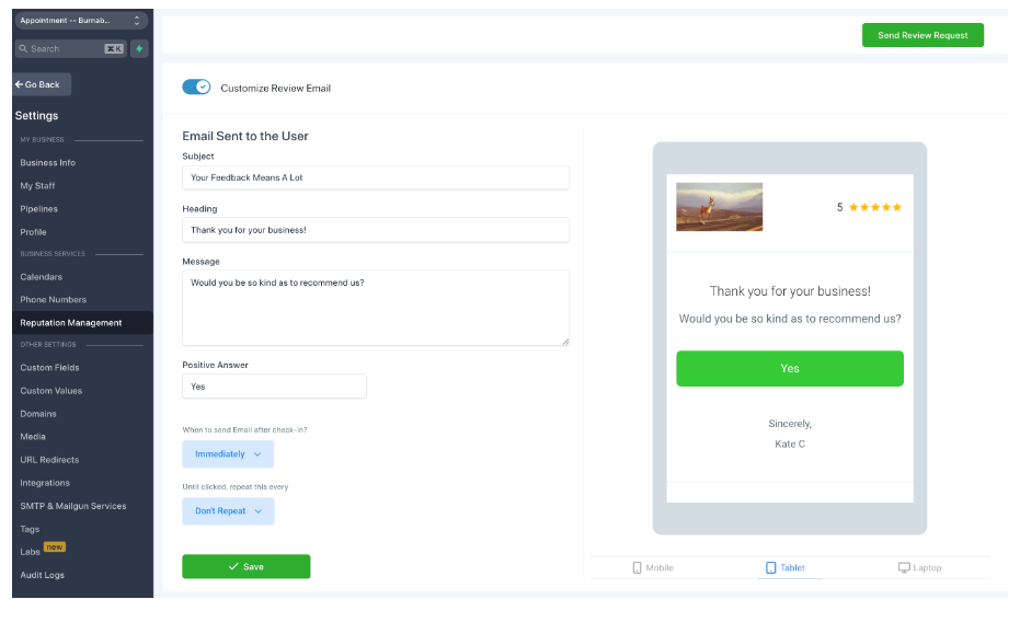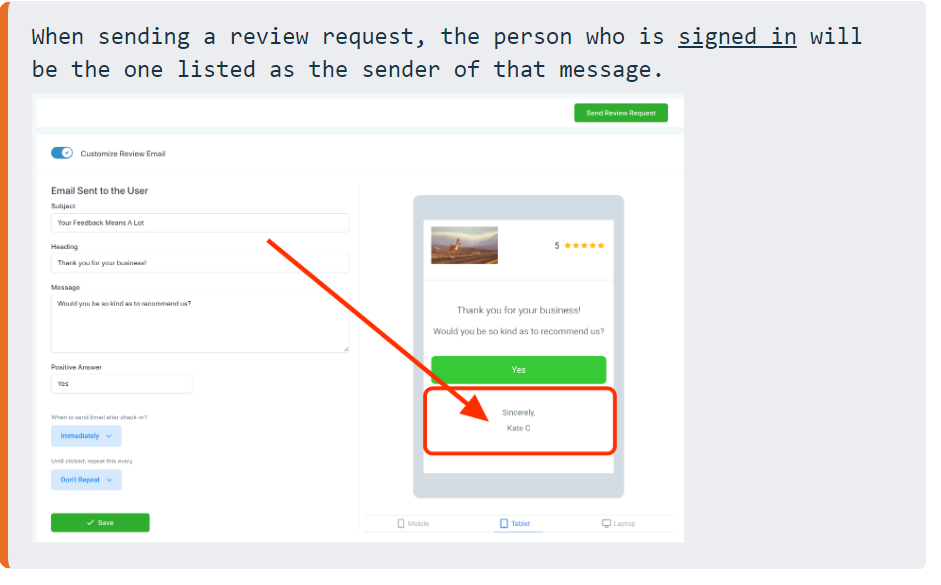 If you are looking to send a review request from the contacts assigned user, please use the Workflows action “Send Review Request” to send a request on behalf of the assigned user.