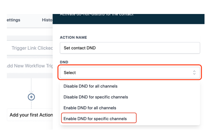 4. Create a workflow that uses "Trigger Link Clicked" as the condition and "Set Contact DND" as the action
