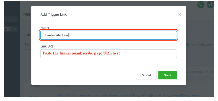 Link URL: Paste the funnel unsubscribe page URL here
