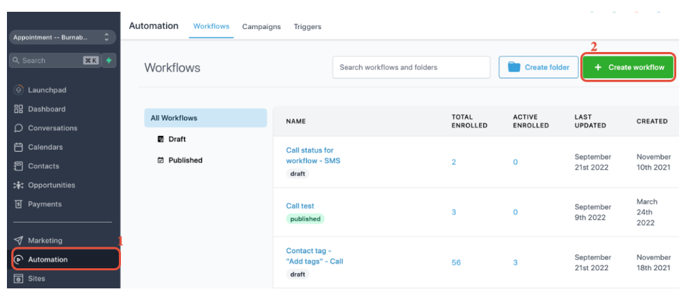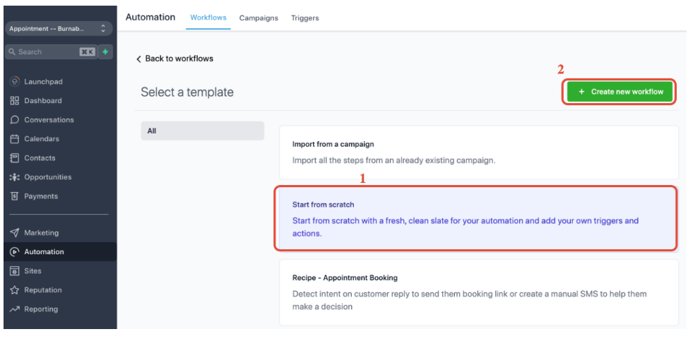 Click on 1. Automation > 2. Create workflow