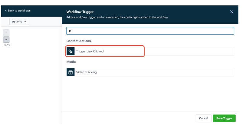 Search for the Trigger Link Clicked workflow trigger