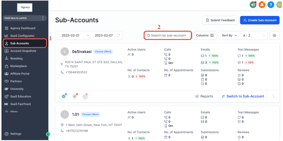 2. Once you are in the agency view, click on Sub-Accounts > Search by sub-account