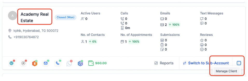 Click on the sub-account Name OR click on the three dots at the bottom right to Manage Client