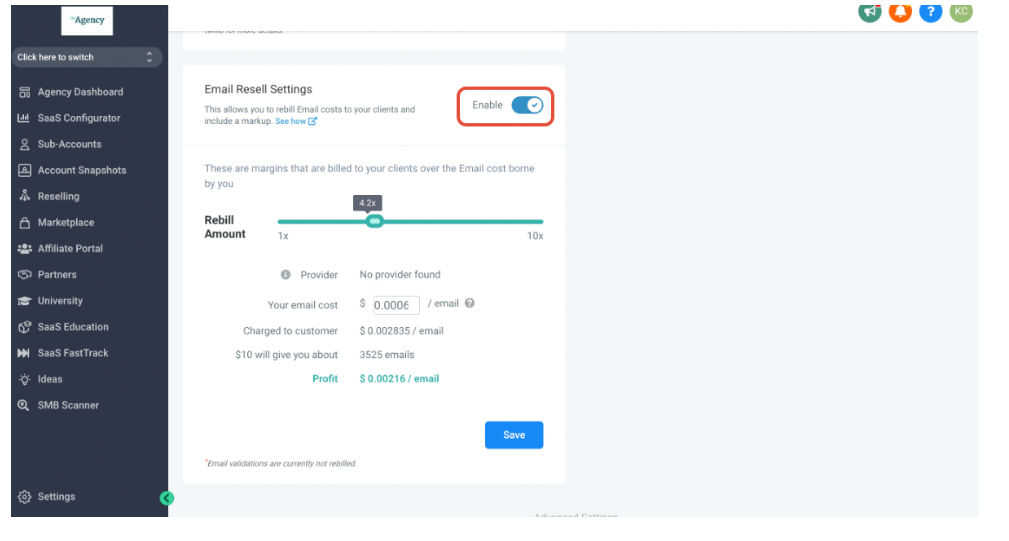 4. Scroll down all the way to the bottom to find Email Resell Settings and toggle the highlighted button here to disable Email rebilling.